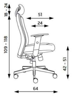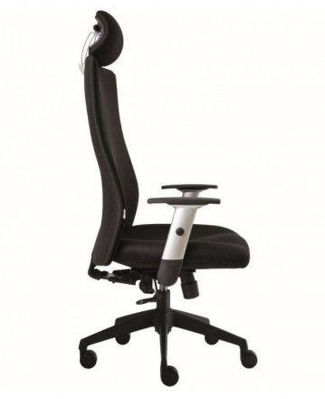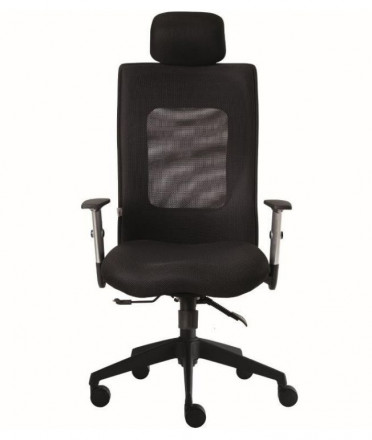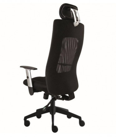 Otočná kancelářská židle se synchronní mechanikou s blokací ve zvolené pozici, s pohodlným čalouněným sedákem (černá prodyšná látka) a opěrákem potaženým prodyšnou síťovinou v černé barvě. Model disponuje nastavitelným 3-D podhlavníkem.