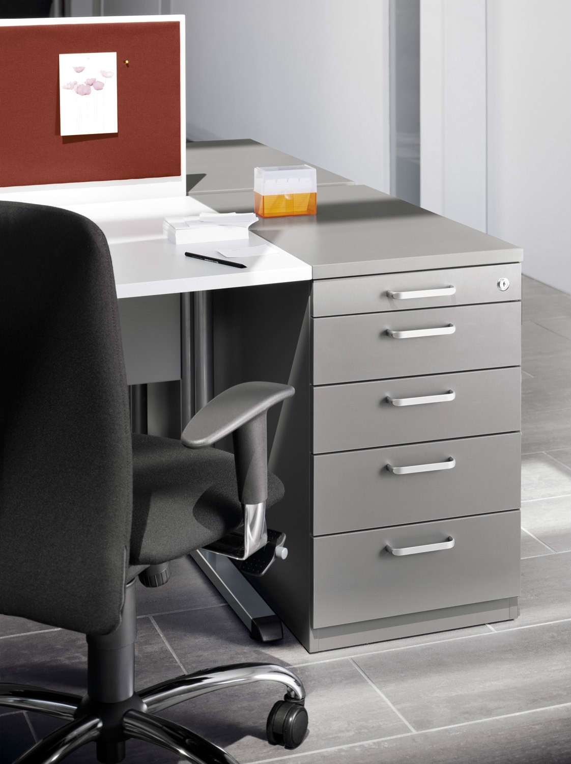 Profesionální, dvojitá pracovní místa s kancelářskými stoly ve tvaru písmene C, umožňují svobodu pohybu. K sestavě patří: obdélníkový kancelářský stůl s přístavkem a psací stůl ve tvaru písmene L, rozdělené čalouněným panelem, přimontovaným ke kancelářskému stolu. Mobilní kontejner a vozík pro počítač. Barvy povrchu: tmavě šedá a platinová.