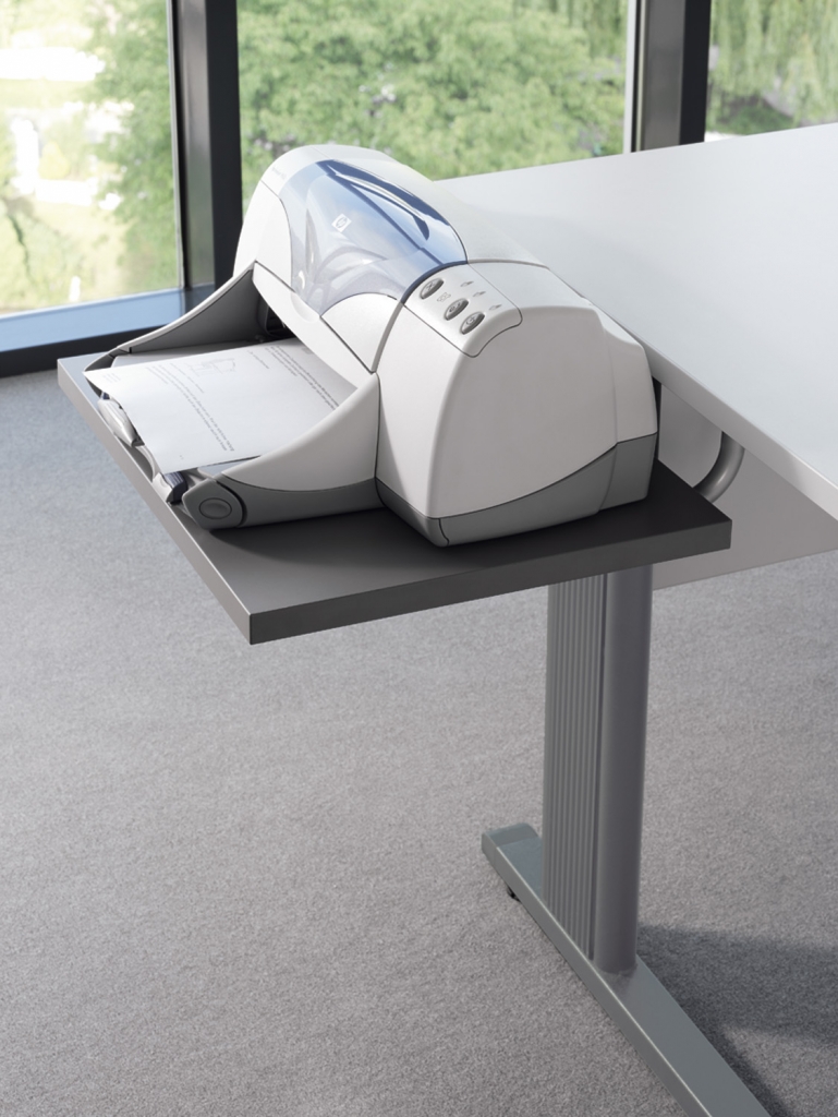 Stůl s C nohou s kovovým trámem používaným jako horizontální vedení kabelů. Nastavení v rozsahu 68–82 cm. › Stůl s panelovou podnoží a s předním krycím panelem. Ocelové nohy kancelářských stolů mohou být buď chromované, nebo stříkané práškovou barvou v odstínu alu. Veškeré desky lze doplnit horizontálním nebo vertikálním žlabem pro kabeláž, vozíkem pro cpu, regálem pro tiskárnu nebo stolními paravany. Výsuvná klávesnice je k dispozici pouze pro nohu typu C a stoly s panelovou podnoží.