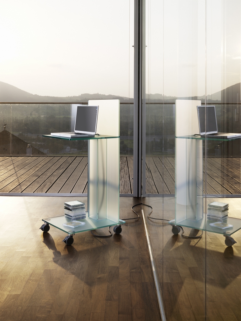 Media Caddy - výjimečné spojení elegantního zpracování a vysoké funkčnosti. Mobilní kancelářský nábytek vyrobený ze satinovaného tvrzeného skla vhodný např. pro obsluhu multimediálních zařízení. Otvory v horní a dolní části umožňují vedení kabeláže. Rozměry: šířka 48 cm, hloubka 54,5 cm, výška 113 cm.