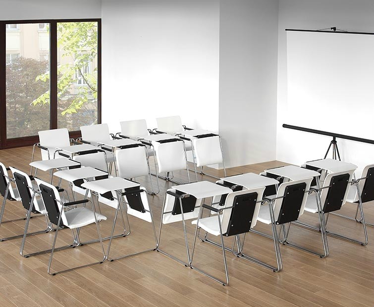 Tyto konferenční židle a stoly jsou navrženy a zkonstruovány s maximální pozorností k detailu. Rukojeť na zadní straně těchto konferenčních židlí zajišťuje snadnou přeměnu židle na stůl a zpět. Vše trvá okamžik - pouze jedno jednoduché sklopení. Tento jednoduchý mechanismus dává konferenčním židlím - stolům jedinečnou flexibilitu.