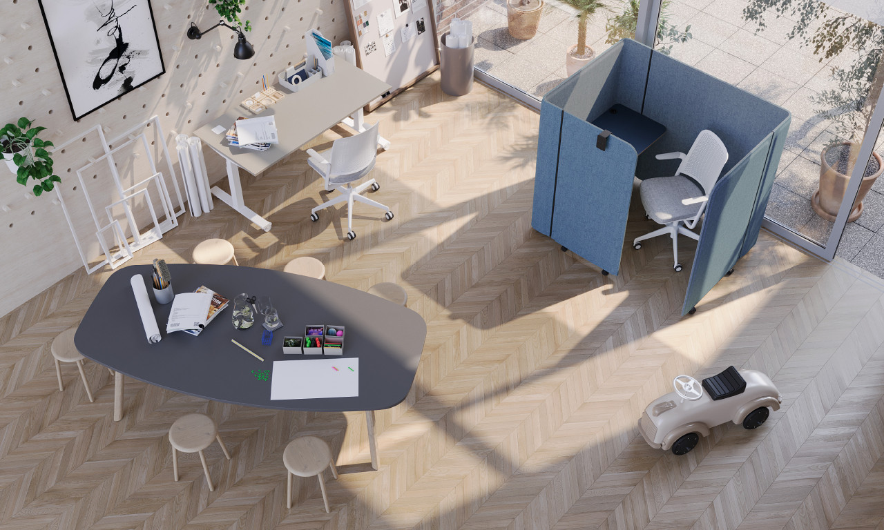 Stoly Creva jsou ideální pro propojení a vytváření prostorů v kanceláři – pro neformální schůzky, ale i pro týmovou práci ve skupinách: pro 2 osoby, 6 osob, 12 osob a nakonec jen pro soustředěnou práci jednoho člověka – je opravdu agilní. A také je to perfektní stůl s možností umístění pro rychlou a efektivní spolupráci.