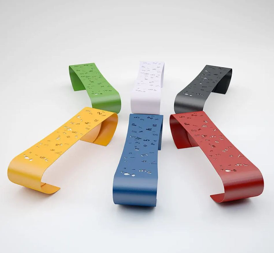 Ocelová lavice jedinečného designu vhodná pro školy, veřejné budovy, zdravotnická zařízení, letiště, muzea, dětská hřiště, sportovní zařízení, bazény, restaurace, bary a další veřejné prostory. Konstrukce lavice je ocelová o tloušťce 6 mm, ohýbaná, řezaná laserem, pozinkovaná a lakovaná se 4 otvory pro upevnění do země (průměr mm 14).