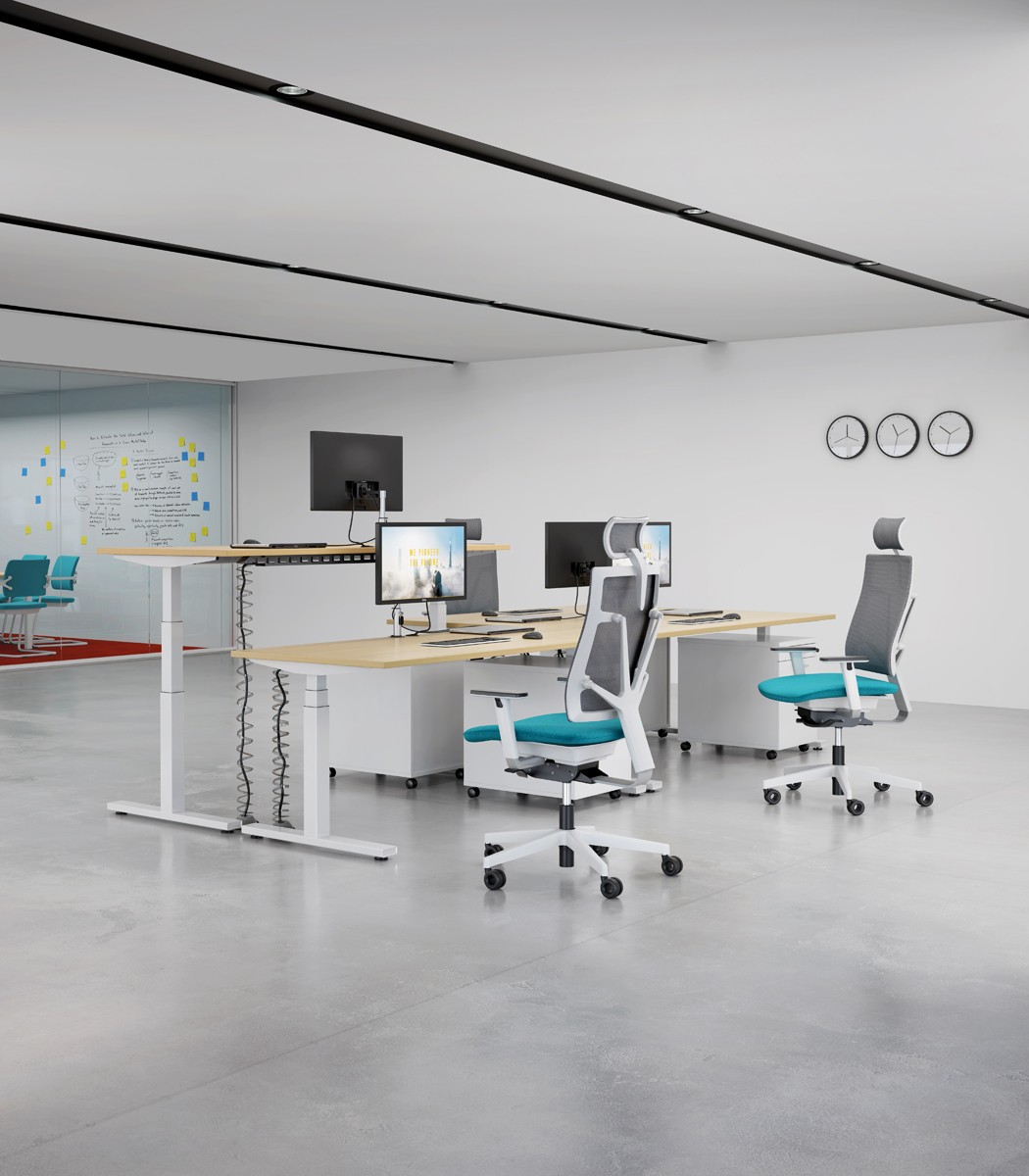 Elektricky a manuálně výškově stavitelné stoly jsou k dispozici s několika rozměry stolových desek v různých dekorech, s možností vrchního a spodního panelu zvyšujícího akustickou pohodu. Podnoží je s povrchovou úpravou bílá nebo černá. K doplňkům také patří možnost zásuvek integrovaných do stolové desky, držáky monitorů a pc nebo bezdrátová nabíječka mobilních telefonů atd.