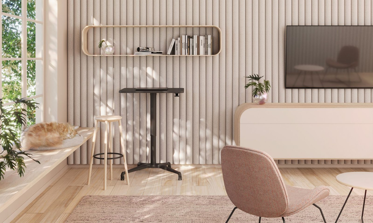 Stoly Aero se skvěle se hodí i do domácí kanceláře, kde běžný, prostorově náročný stůl není k dispozici. Výšku stolu Aero si můžete nastavit pomocí páky umístěné v pravém rohu desky stolu. Stačí ji stisknout pro zvednutí stolu. Pro snížení výšky použijte páku a druhou rukou zatlačte desku stolu dolů.