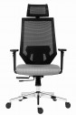 Kancelářská židle moderního designu s výškově stavitelnými područkami, hloubkově stavitelným sedákem a úhlově nastavitelným podhlavníkem. Zádová opěra z černé síťoviny je opatřena výškově stavitelnou bederní výztuhou, sedák je čalouněný šedou látkou.